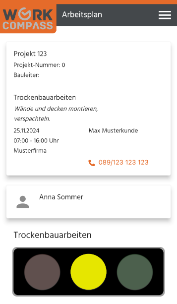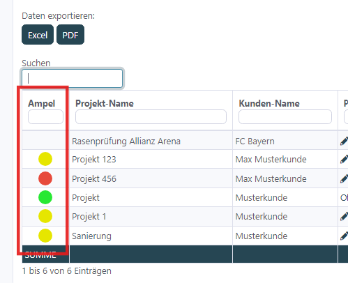 Im Menü "Projekte" zeigt ein Ampelsystem den Fortschritt der Tätigkeiten an.