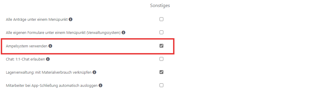 Das Ampelsystem kann unter "Admin" -> "Einstellungen" im Bereich "Sonstiges" (ganz unten) aktiviert oder deaktiviert werden.
