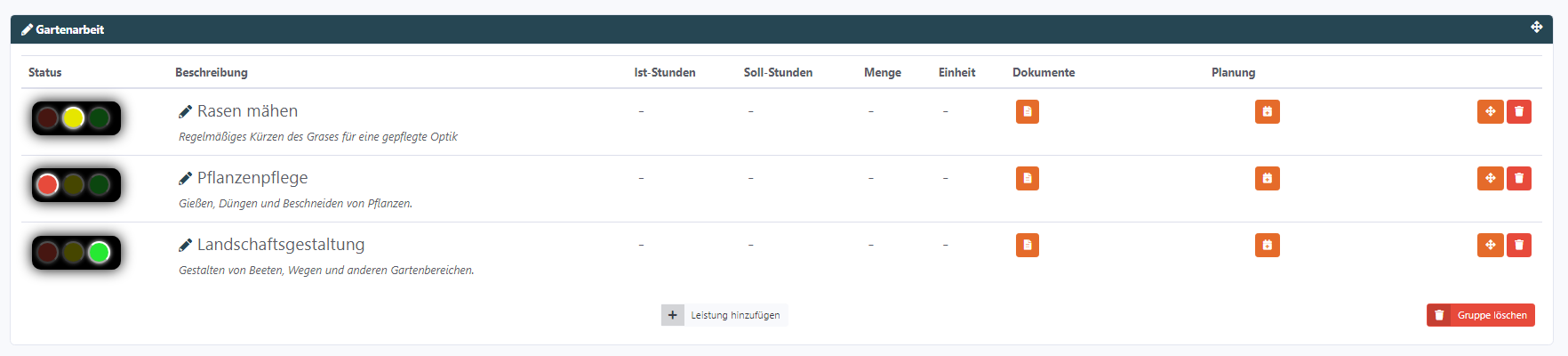 In der Projekt-Detailansicht unter dem Reiter "Leistungsverzeichnis" ist für jede Tätigkeit eine Ampel verfügbar, um den aktuellen Fortschritt festzuhalten.